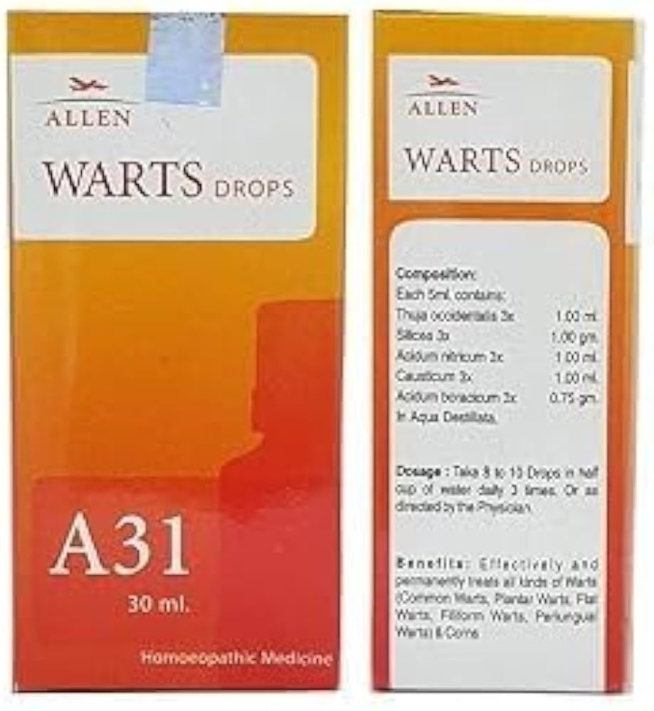 Nformation about Allen A31 Warts Drop Allen A31 Warts Drop acts as an antiseptic disinfectant. The drops treat all kinds of warts, corns and horny skin eruptions. Key Ingredients: Thuja occidentalis Silicea Acidum nitricum Causticum Acidum boracicum Antimonium Crudum