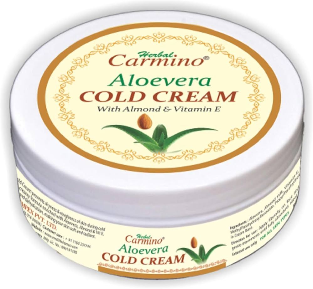 Carmino aloe vera cold cream prevents dryness roughness of skin during cold weather, it extra rich creamy formula is enriched with aloe vera, almond vitamin e.