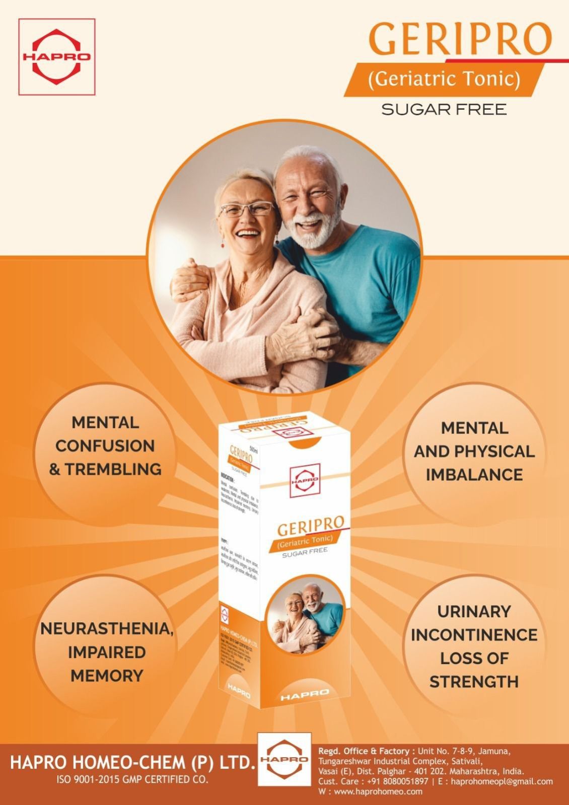 Hapro GERIPRO Sugar Free - (Geriatric Tonic) Useful for everyday problems of the elderly including mental confusion, trembling due to weakness, Mental and physical imbalance, Neurasthenia, Impaired memory, Urinary incontinence, loss of strength. INDICATION :- Discharge of prostatic fluid on every motion with itching of prepuce and enlargement. Urine starts and stops again and again. Swelling of whole body. Agonizing Pain, Restlessness, Coldness is relieved with this remedy. Improves urine flow in old age. Sleepy with most all complaints is an indication for this remedy.