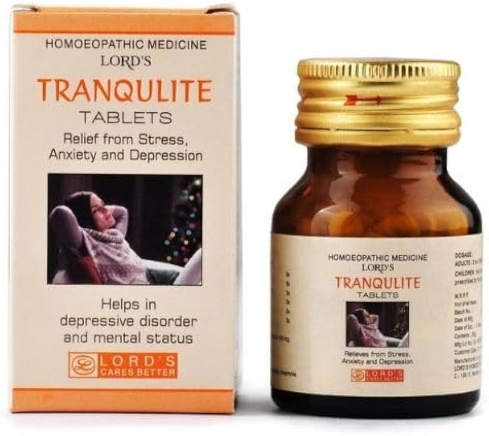 About Lords Tranqulite Tablets Lords Tranqulite Tablets is a blend of well known homoeopathic medicines. Tranqulite raises brain threshold, so that the body can cope up with stress and anxiety better. Tranqulite improves self-confidence to deal with problems and situations effectively by relieving stress, anxiety and depression. Tranqulite promotes natural sleep with clear awakening and helps depressed individual to work. Indications of Lords Tranqulite Tablets: Anxiety, Tension, Depression, Insomnia. Composition of Lords Tranqulite Tablets: Each tablet contains: Abrus precatorius - 6x Aconitum napellus - 6x Calendula officinalis - 3 Viburnum opulus - 3x Kali Phosphoricum - 3x Zincum Picricum - 3x Excipients q.s. Dosage/Directions for use of Lords Tranqulite Tablets: Adults: 2 to 4 tablets 4 to 6 times daily. Children: Half of the adult's dose. Terms and Conditions Homeopathic products have several uses and should be taken on the basis of symptom similarity. Results may vary depending upon the conditions.